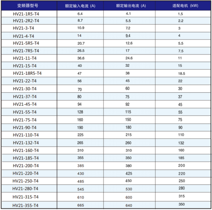 HV21系列变频器适用于功率范围1.5kW-355kW的400V三相异步电机。可广泛应用于标准风机和泵类控制系统。符合IEC/EN61800-3,IEC/EN61000-4,IEC/EN60721-3,IEC/EN61800-5-1等国际标准。